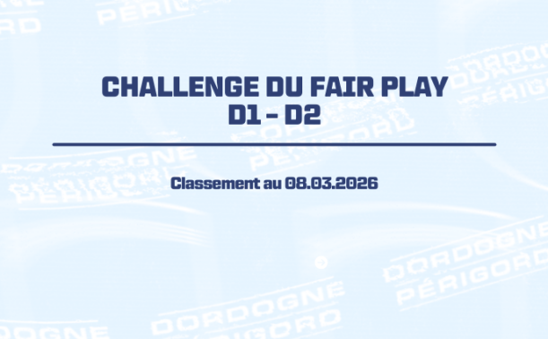 Retrouvez ci-dessous le classement du Challenge du Fair Play en Départemental 1 Seripub24 et Départemental 2 Happy Home, classement arrêté au 08 mars 2026. DEPARTEMENTAL 1 SERIPUB 24 DEPARTEMENTAL 2 HAPPY HOME