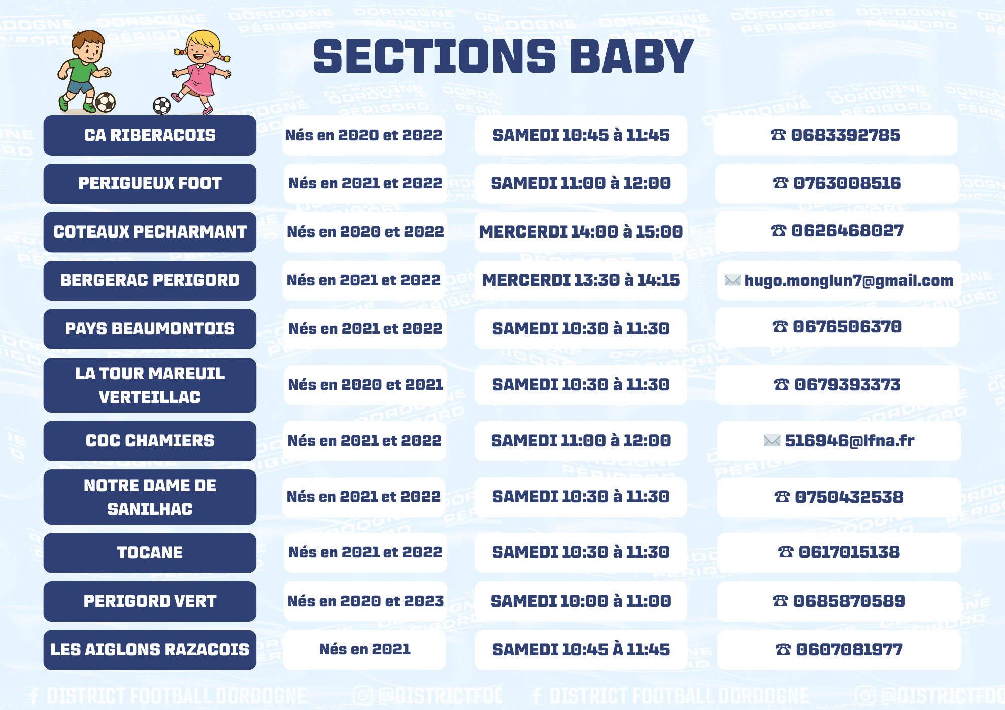 Le District Football Dordogne-Périgord a rassemblé les informations transmises par les clubs afin de vous présenter les différents créneaux Baby Foot disponibles sur le territoire.